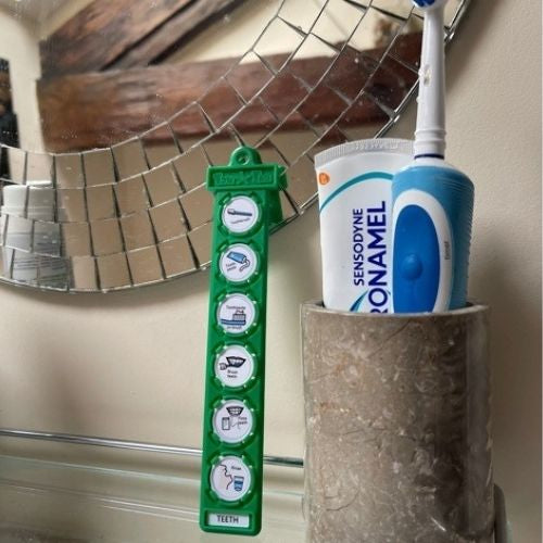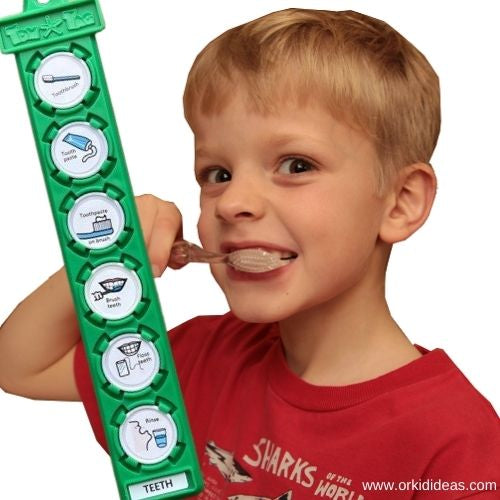 - Teeth: Toothpaste, toothbrush, rinse, toothpaste on brush, brush teeth, floss teeth