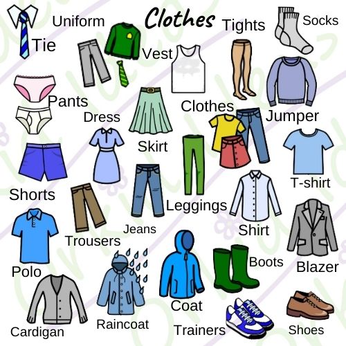 - Clothes: Uniform, clothes, dress, cardigan, tie, blazer, polo shirt, jumper, t-shirt, vest, shirt, skirt, jeans, pants, trousers, shorts, socks, shoes, boots, trainers, tights, coat, raincoat, leggings