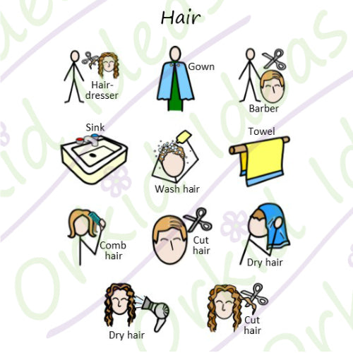 - Hair: hairdresser, barber, gown, sink, wash hair, towel, comb hair, cut hair (male/female), dry hair