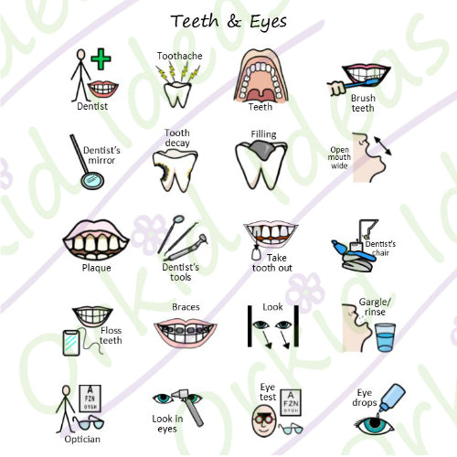- Teeth & eyes: dentist, toothache, teeth, brush teeth, dentist’s mirror, tooth decay, filling, open mouth wide, plaque, dentist’s tools, take tooth out, dentist’s chair, floss teeth, braces, gargle/rinse, optician, look, look in eyes, eye test, eye drops