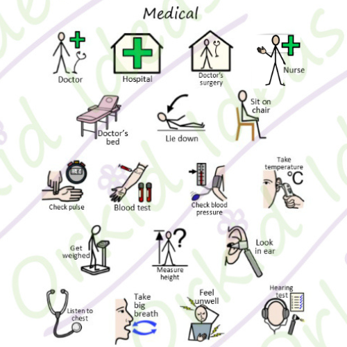 - Medical: doctor, nurse, hospital, doctor’s surgery, doctor’s bed, lie down, sit on chair, check pulse, blood test, check blood pressure, take temperature, get weighed, measure height, look in ear, listen to chest, take big breath, feel unwell, hearing test