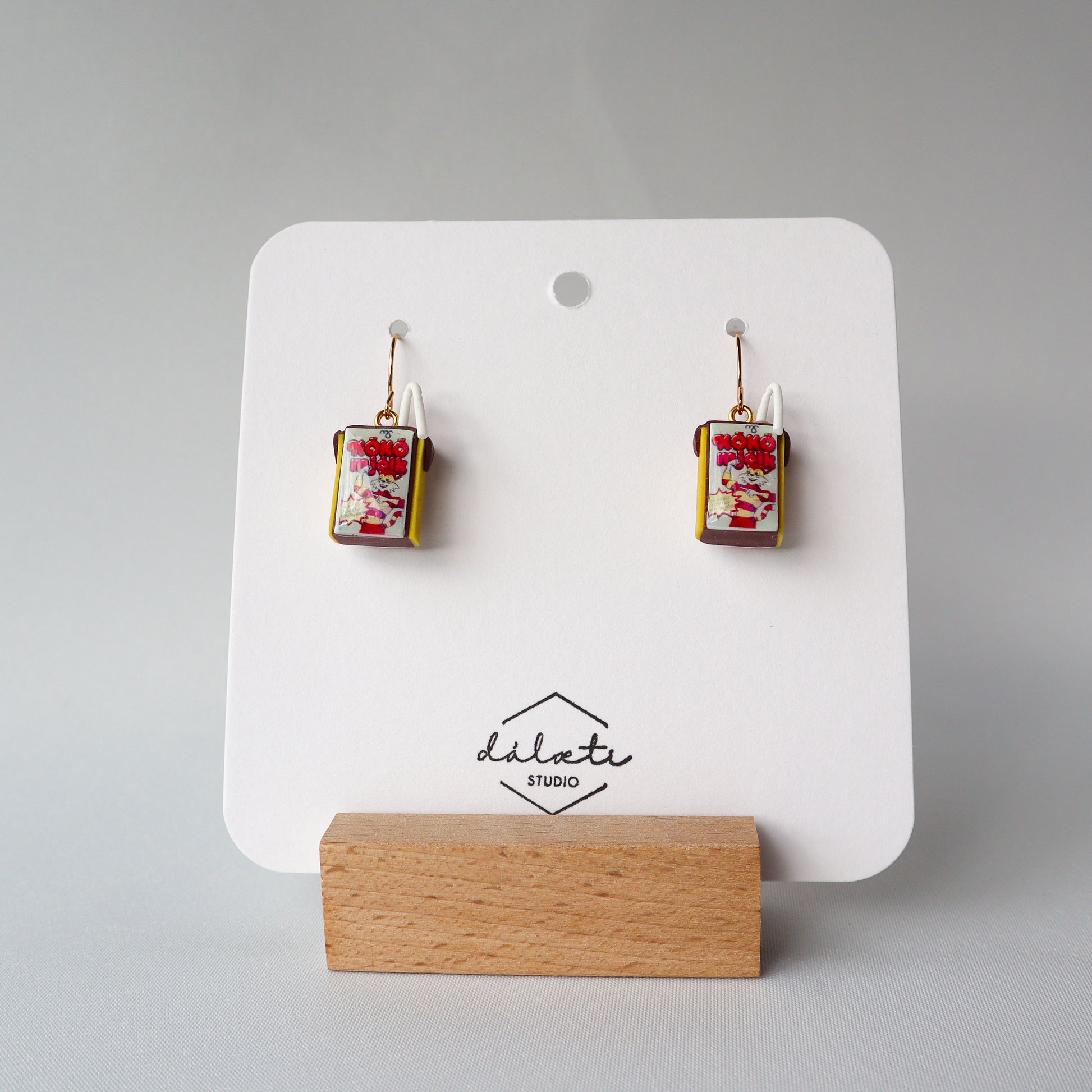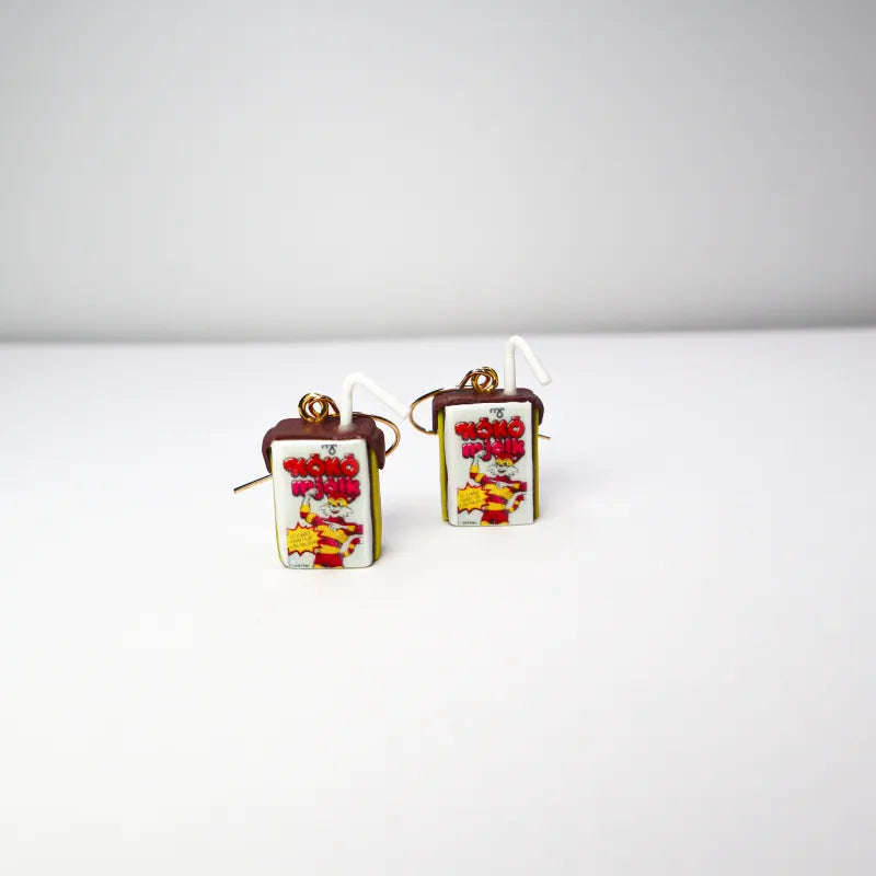 Kókómjólkur eyrnalokkar úr leir. Ert þú eða einhver sem þú þekkir kókómjólkurfíkill? Þá eru þessir nauðsynlegir í safnið. Vektu kátínu með pínulitla kókómjólk í eyrunum.