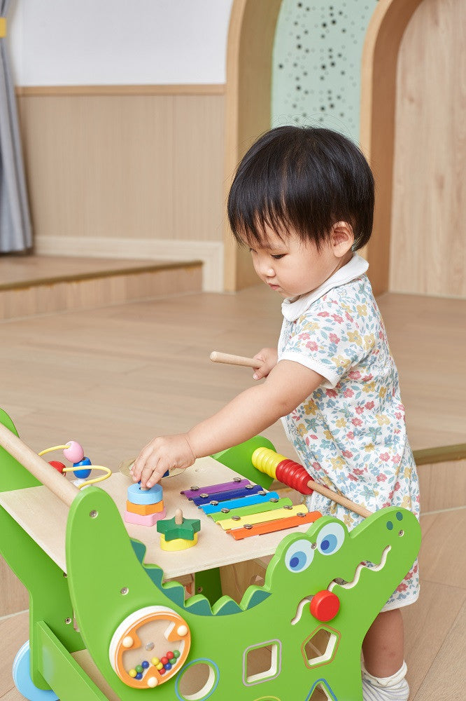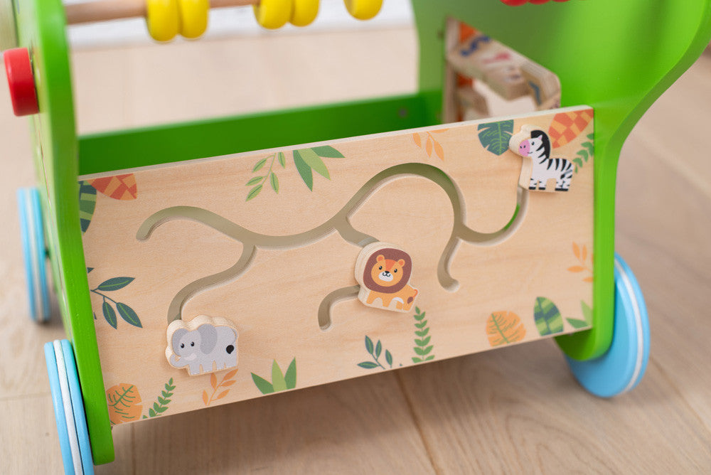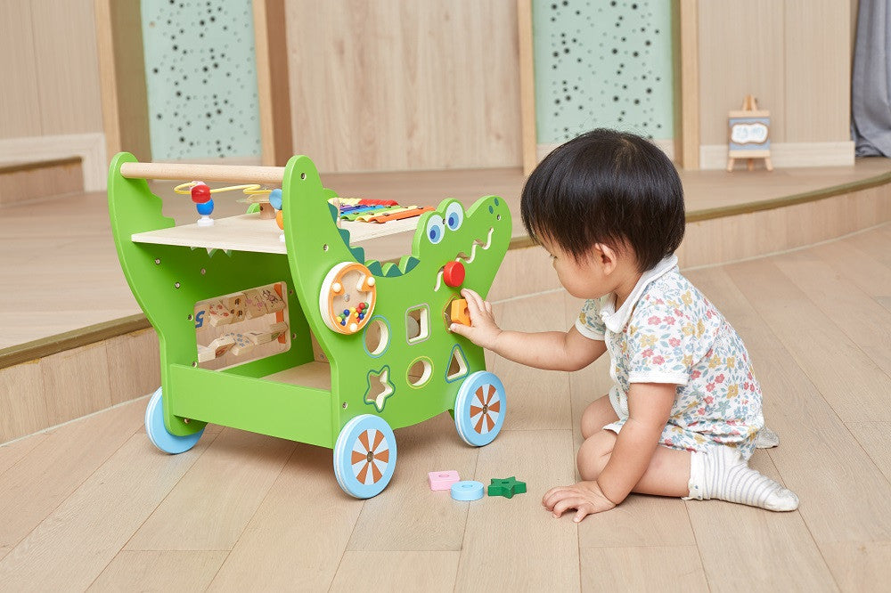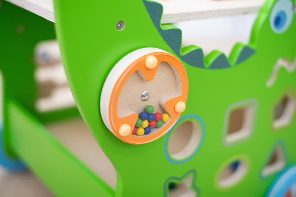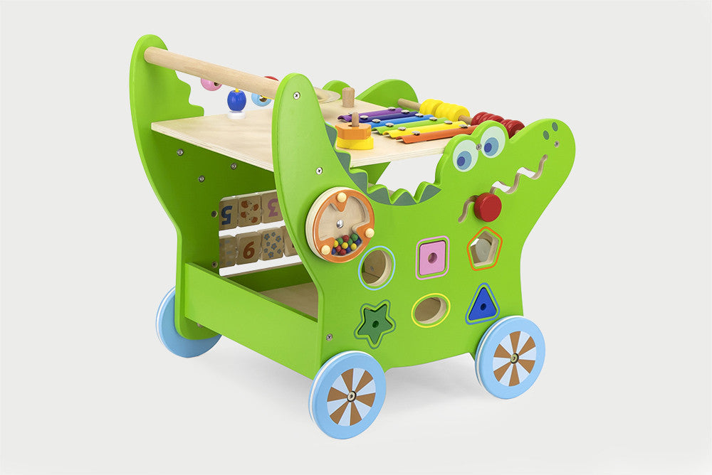 Wooden activity walker with fun crocodile features and manipulative activities on each side. Includes shape matching, jungle maze, bead maze, xylophone, number blocks, counting beads and interlocking cogs. Ideal for confident toddlers, providing a range of hands-on learning opportunities including developing coordination and motor skills, problem solving and language development.
