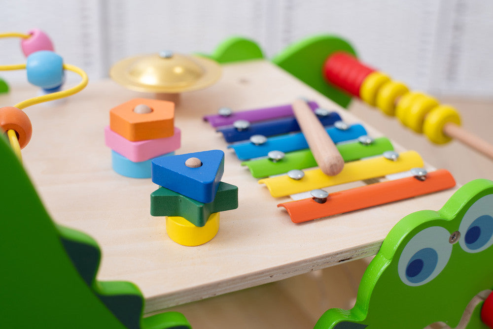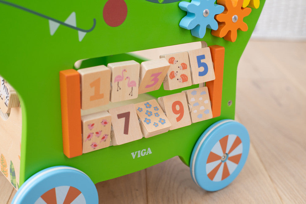 Virknivagn krókódílaþema og fjölbreyttum verkefnum á hliðum þess. Þetta leikfang er tilvalið fyrir börn sem eru farin að ganga örugglega, þar sem það býður upp á hagnýta leikreynslu til að þjálfa samhæfingu handa og augna, fínhreyfingar, lausnaleit og málþroska. Ýmsar skemmtilegar þrautir á vagninum sem er litríkur og slitsterkur. Fullkomin viðbót á heimilið, leikskólann, biðstofuna eða þar sem börn leika sér.