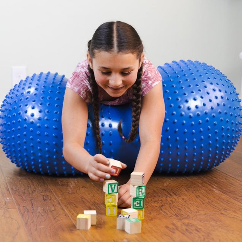 Deep pressure applied when sitting, lying across or leaning on the ball, calms, relaxes and quiets kids giving a sense of security and well-being.
