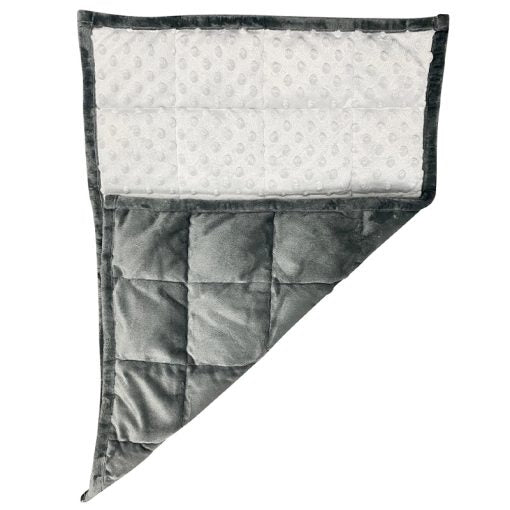 Þyngingarpúðinn er hannaður með bæði þægindi og útlit í huga. Önnur hliðin er klædd mjúku, gráu velúrefni sem er notalegt viðkomu, en hin hliðin er með áferð sem örvar snertiskynið á mildan hátt.